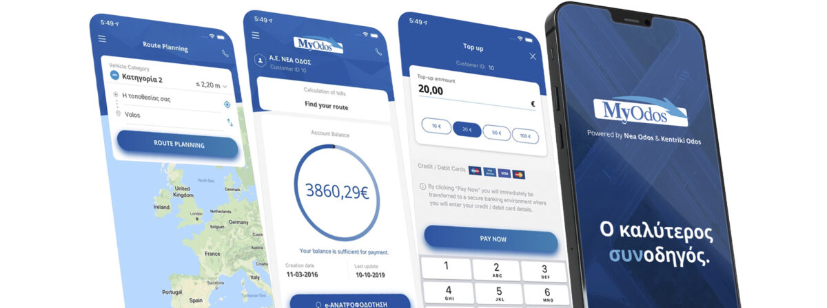 Στο πλαίσιο αυτό και με στόχο την παροχή ολοκληρωμένων υπηρεσιών εξυπηρέτησης, η Νέα Οδός παρουσίασε πρόσφατα και την 1η εφαρμογή αυτοκινητοδρόμων για κινητά τηλέφωνα. Η εφαρμογή MyOdos προσφέρει ανάμεσα σε πολλά άλλα και την υπηρεσία Σχεδιασμός & Υπολογισμός Διαδρομής.