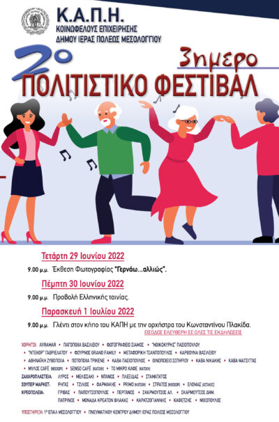Την αυλαία των φετινών εκδηλώσεων του Δήμου Ι.Π. Μεσολογγίου με τίτλο «Καλοκαίρι 2022: Όλος ο Δήμος μια μεγάλη γιορτή & μια αγκαλιά πολιτισμού» ανοίγει το Κ.Α.Π.Η. με την διοργάνωση του 2ου (3ήμερου) Πολιτιστικού Φεστιβάλ.