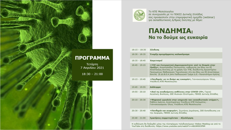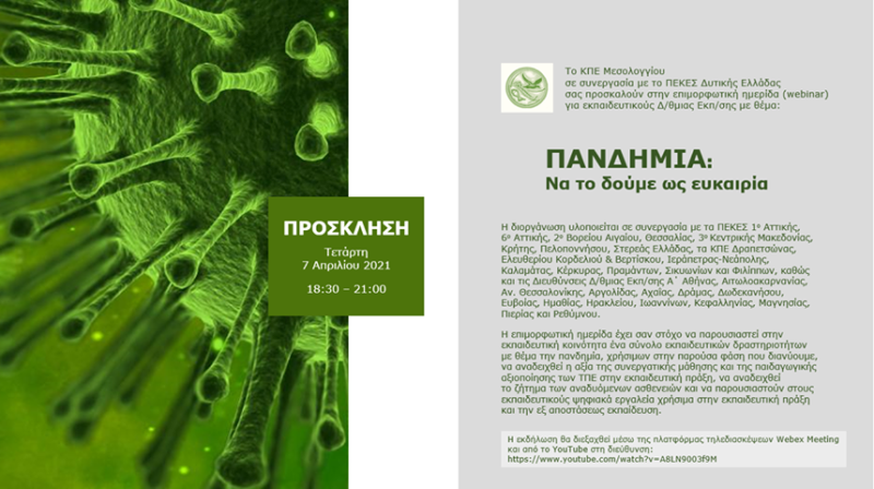 Διαδικτυακή ημερίδα για εκπαιδευτικούς Δ/θμιας Εκπ/σης με θέμα «Πανδημία: να το δούμε ως ευκαιρία» θα διεξαχθεί σήμερα, Τετάρτη 7/04/2021 και ώρα 18:30- 21:00.