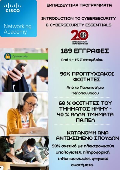 Σε διάστημα μόλις 15 ημερών (1 – 15 Σεπτεμβρίου) 189 φοιτητές και φοιτήτριες του Πανεπιστημίου Πελοποννήσου έσπευσαν να εγγραφούν στα προγράμματα Introduction to Cybersecurity και Cybersecurity Essentials για αρχάριους και μέσου επιπέδου γνώστες, αντίστοιχα, τα οποία υλοποιούνται με τη μέθοδο της αυτοδιδασκαλίας, στο πλαίσιο της λειτουργίας της Ακαδημίας της Cisco στο Τμήμα ΗΜΜΥ. Δημιουργήθηκαν, έτσι, 9 τάξεις για το εισαγωγικό πρόγραμμα αρχαρίων και 8 για το intermediate.