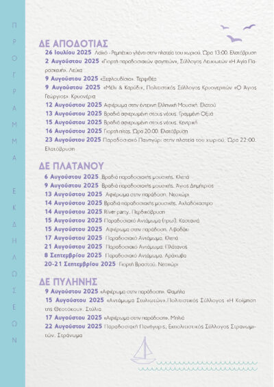 Από τα τέλη Ιουλίου έως τα μέσα Σεπτεμβρίου, στις Δημοτικές Ενότητες Αποδοτίας, Πλατάνου και Πυλήνης του Δήμου Ναυπακτίας ζωντανεύουν τα χωριά με λαϊκά και ρεμπέτικα γλέντια, μουσικά αφιερώματα, γιορτές τοπικών γεύσεων και παραδοσιακά ανταμώματα.