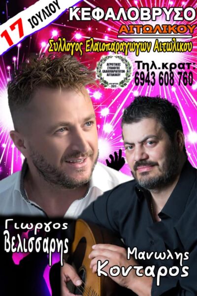 Κι αυτό γιατί στο “πανηγύρι” που διοργανώνει ο Σύλλογος Ελαιοπαραγωγών Αιτωλικού “πρωταγωνιστές” θα είναι ο Γιώργος Βελισσάρης και ο Μανώλης Κονταρός.