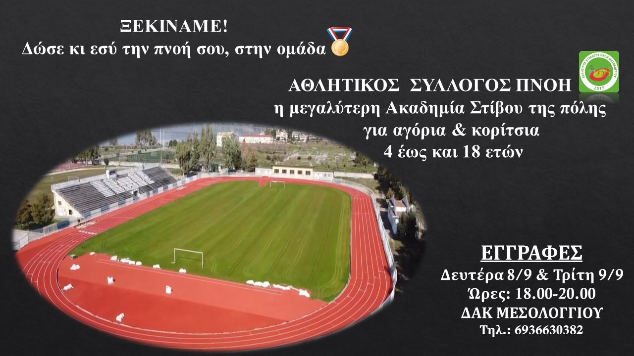 Για νέα μέλη, οι εγγραφές θα πραγματοποιηθούν στο γραφείο της Πνοής στο Δημοτικό Στάδιο Μεσολογγίου τις εξής ημέρες και ώρες: