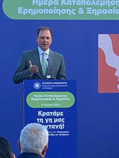 Εναρκτήριο λάκτισμα για αλλαγή πορείας, σε ό,τι αφορά τις δράσεις και τις πολιτικές για την αντιμετώπιση του φαινομένου της ερημοποίησης και της ξηρασίας στη χώρα μας, χαρακτήρισε ο ΥΠΑΑΤ κ. Σπήλιος Λιβανός την επανασύσταση της Εθνικής Επιτροπής για την αντιμετώπιση του φαινομένου, το οποίο, όπως είπε στην ομιλία του κατά την εκδήλωση για την παρουσίαση της Επιτροπής, αποτελεί απειλή για το 50% του ελλαδικού χώρου, στην επόμενη 20ετία, αν μείνουμε απαθείς.