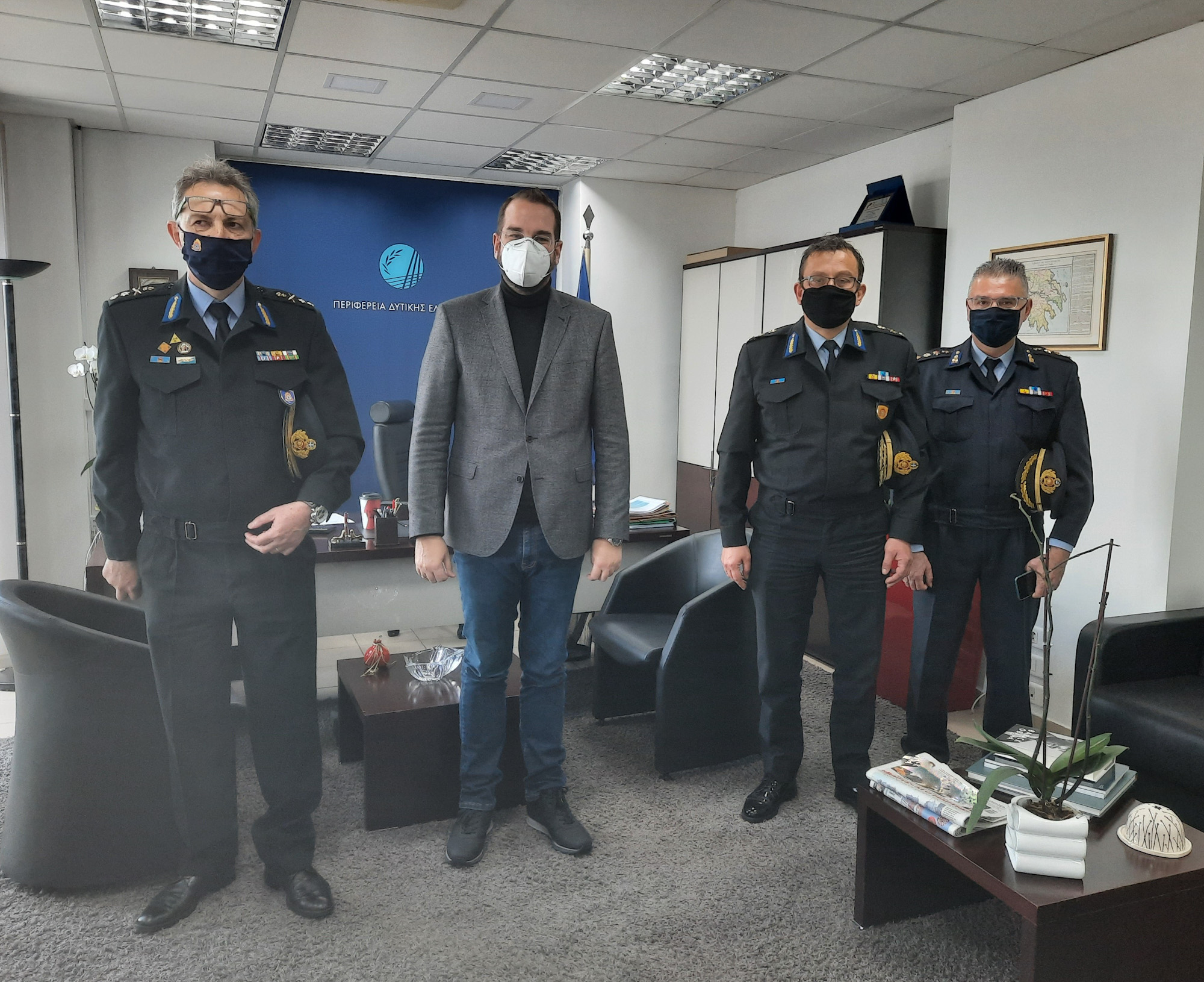 Τον Περιφερειάρχη Δυτικής Ελλάδας Νεκτάριο Φαρμάκη επισκέφθηκαν σήμερα Δευτέρα 8 Φεβρουαρίου 2021 ο Υποστράτηγος Γεώργιος Πουρναράς, Συντονιστής Περιφερειακών Διοικήσεων Δυτικής Ελλάδας, Πελοποννήσου και Ιονίων Νήσων με έδρα την Πάτρα, ο Αρχιπύραρχος Ανδρέας Στεμπίλης, Περιφερειακός Διοικητής της Πυροσβεστικής Υπηρεσίας Δυτικής Ελλάδας και ο Πύραρχος Λουκάς Μούτσελος, Διοικητής της Πυροσβεστικής Υπηρεσίας Αχαΐας, με την ευκαιρία της ανάληψης των νέων τους καθηκόντων.