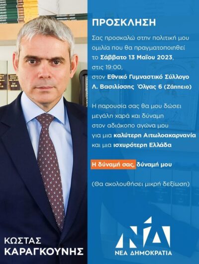 Ο βουλευτής της Νέας Δημοκρατίας, Κώστας Καραγκούνης απευθύνει ανοιχτή πρόσκληση στους Αιτωλοακαρνάνες της Αττικής, για την κεντρική εκδήλωση-ομιλία του, στην Αθήνα , το Σάββατο 13/5 και ώρα 19:00 στον Εθνικό Γυμναστικό Σύλλογο Λ. Βασιλίσσης Όλγας 6 (Ζάππειο).