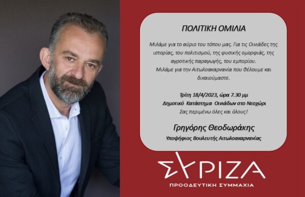 Ανοιχτή πολιτική ομιλία θα πραγματοποιήσει ο υποψήφιος Βουλευτής Αιτωλοακαρνανίας του ΣΥΡΙΖΑ-ΠΣ Γρηγόρης Θεοδωράκης την Τρίτη 18-04-2023, στις 07:30μμ στο Δημοτικό κατάστημα Οινιαδών στο Νεοχώρι.