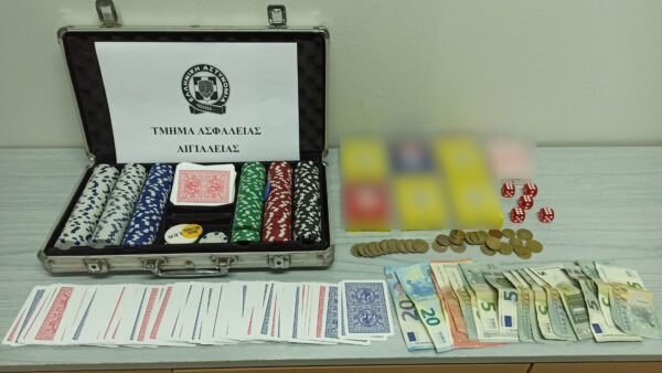 - Κατασχέθηκαν τράπουλες, μεταλλική βαλίτσα με μάρκες και ζάρια, καθώς και χρηματικό ποσό