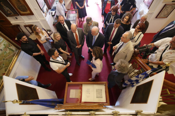 Στο Μουσείο Ιστορίας & Τέχνης – Δημοτική Πινακοθήκη (παλιό Δημαρχείο) με τον Δήμαρχο κ. Κώστα Λύρο, μέλη του Δημοτικού Συμβουλίου και μέλη της Επιτροπής Διοργάνωσης των εκδηλώσεων του Μεσολογγίου για το 2021, μπροστά το αυθεντικό έγγραφο του “Ύμνος εις την Ελευθερία” του Διονύσιου Σολωμού.