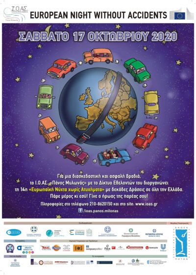 Το Ινστιτούτο Οδικής Ασφάλειας (Ι.Ο.ΑΣ.) «Πάνος Μυλωνάς» διοργανώνει, το Σάββατο 17 Οκτωβρίου 2020 την 14η «Ευρωπαϊκή Νύχτα χωρίς Ατυχήματα» σε 34 μεγάλες  πόλεις στην Ελλάδα.  Ο κεντρικός της άξονας είναι ότι «αλκοόλ και οδήγηση δεν πάνε μαζί» ενώ το μήνυμά στην Ελλάδα είναι η προτροπή, στις παρέες, να ορίσουν ένα άτομο που δεν θα καταναλώσει ποτό εκείνη τη βραδιά και θα αναλάβει τον ρόλο του «οδηγού της παρέας»!