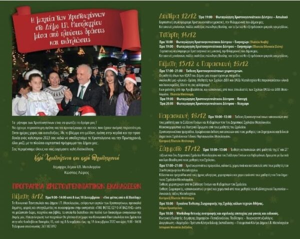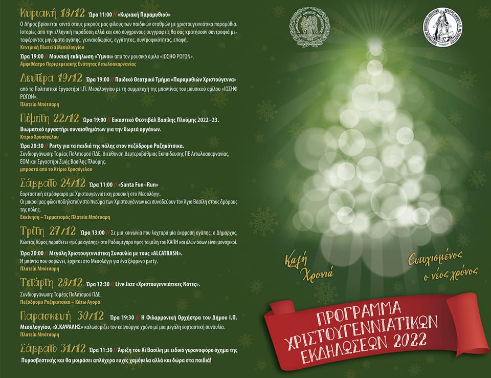 “Ο Δήμος Ι.Π. Μεσολογγίου διοργανώνει και φέτος ένα πλούσιο Χριστουγεννιάτικο Πρόγραμμα, έχοντας ως στόχο τη μετάδοση της μαγικής ατμόσφαιρας των Χριστουγέννων και τη δημιουργία ενός γιορτινού κλίματος σε όλο το εύρος του Δήμου μας.