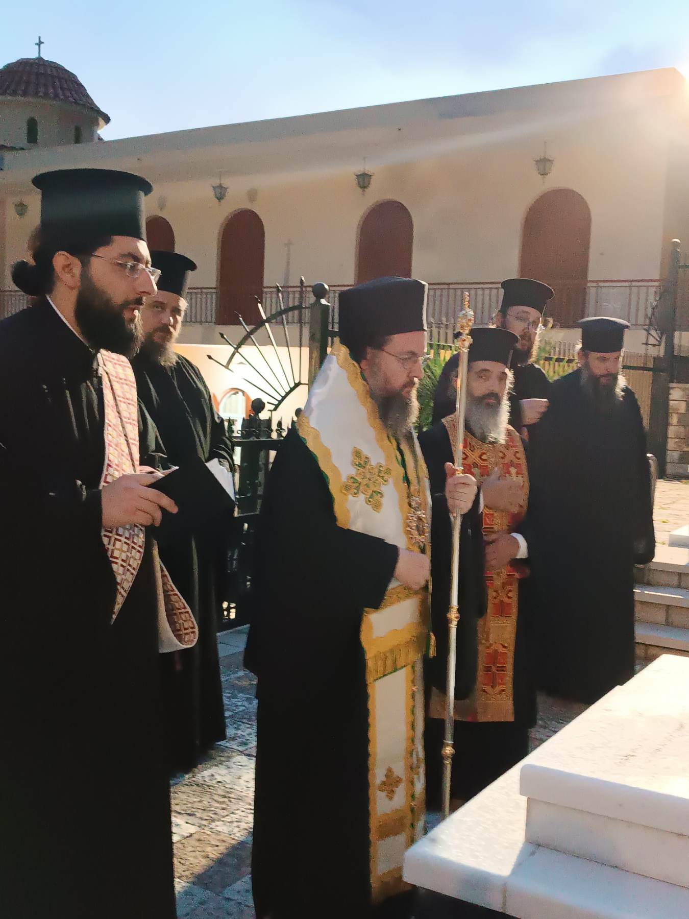 Κατά την άφιξή του τέλεσε τρισάγιο στους τάφους του Μακαριστού Μητροπολίτου Αιτωλίας και Ακαρνανίας Κυρού Θεοκλήτου και του μακαριστού Καθηγουμένου Αρχιμ. Ιεροθέου Σπανομήτσου, που βρίσκονται στον περίβολο της Μονής.