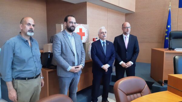 Κατά την επίσκεψή του ο Πρόεδρος του Ε.Ε.Σ προσέφερε στην Περιφέρεια Δυτικής Ελλάδας υγειονομικό υλικό που περιελάμβανε 5.000 μάσκες προστασίας.