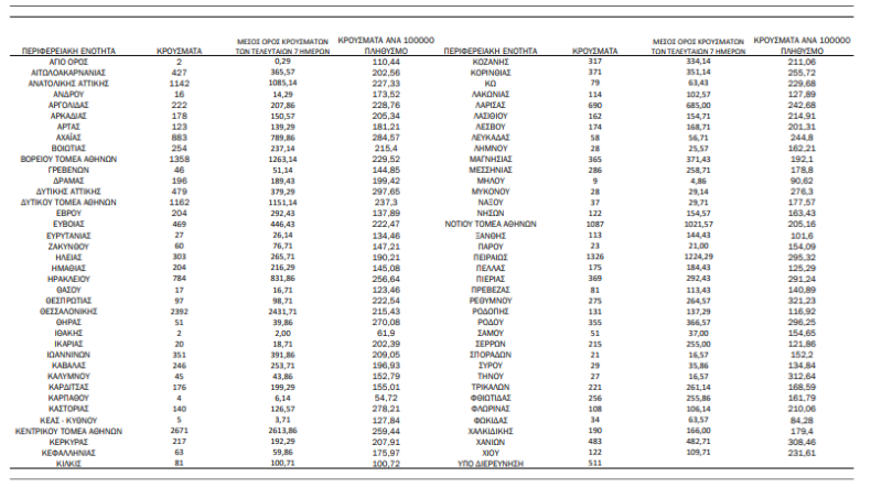 Τα νέα εργαστηριακά επιβεβαιωμένα κρούσματα της νόσου που καταγράφηκαν τις τελευταίες 24 ώρες είναι 24.246, εκ των οποίων 68 εντοπίστηκαν κατόπιν ελέγχων στις πύλες εισόδου της χώρας. Ο συνολικός αριθμός των κρουσμάτων ανέρχεται σε 1.592.460 (ημερήσια μεταβολή +1.5%), εκ των οποίων 49.9% άνδρες. Με βάση τα επιβεβαιωμένα κρούσματα των τελευταίων 7 ημερών, 633 θεωρούνται σχετιζόμενα με ταξίδι από το εξωτερικό και 2.113 είναι σχετιζόμενα με ήδη γνωστό κρούσμα. To 𝑅𝑡 για την επικράτεια βάσει των κρουσμάτων εκτιμάται σε 1.40 (95% ΔΕ: 1.22 – 1.58)