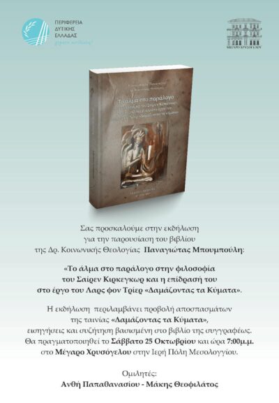 Μια ξεχωριστή εκδήλωση φιλοσοφίας και κινηματογράφου φιλοξενεί το Μέγαρο Χρυσόγελου στο Μεσολόγγι, το Σάββατο 25 Οκτωβρίου, στις 7 μμ. με την παρουσίαση του βιβλίου της Δρ. Παναγιώτας Μπουμπούλη «Το άλμα στο παράλογο στη φιλοσοφία του Σαίρεν Κίρκεγκωρ και η επίδρασή του στο έργο του Λαρς φον Τρίερ “Δαμάζοντας τα Κύματα”»