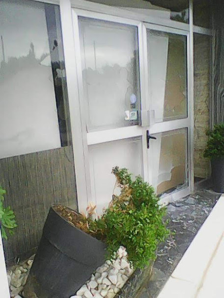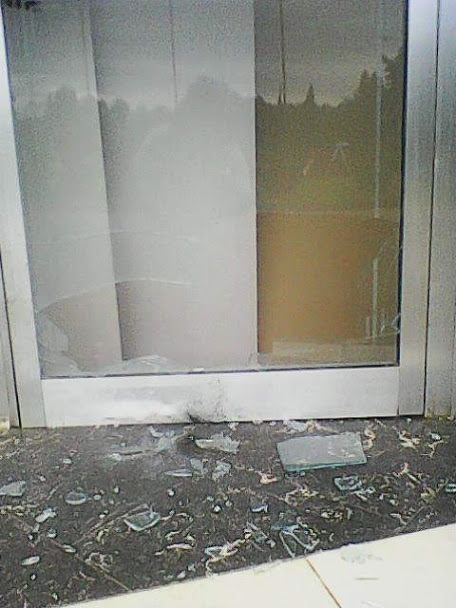 Όπως μπορείτε να δείτε στις φωτογραφίες προφανώς από ρίψη αντικειμένων, έσπασαν τα τζάμια της εισόδου του ξενοδοχείου.