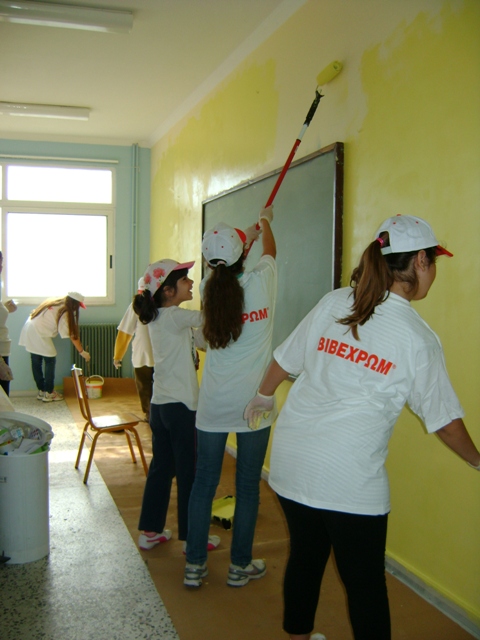 Το βάψιμο θα γίνει με την εθελοντική εργασία γονέων, μαθητών, εκπαιδευτικών και φίλων του Δημοτικού Σχολείου, με φιλικά προς το περιβάλλον χρώματα, ευγενική προσφορά – χορηγία, της βραβευμένης για την περιβαλλοντική ευαισθησία της, εταιρίας ΒΙΒΕΧΡΩΜ.