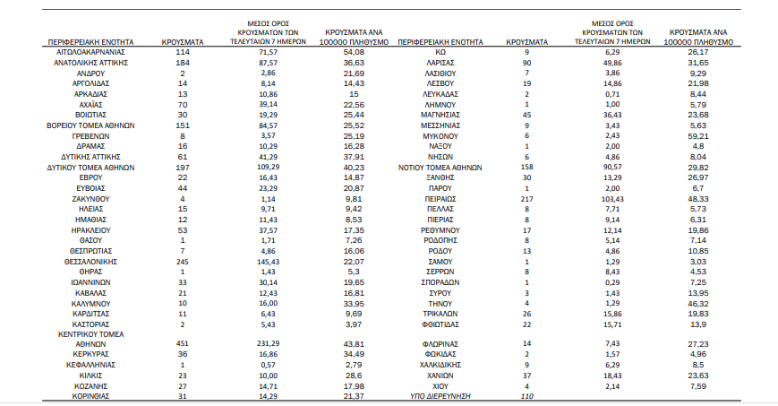 Τα νέα εργαστηριακά επιβεβαιωμένα κρούσματα της νόσου που καταγράφηκαν τις τελευταίες 24 ώρες είναι 2.812, εκ των οποίων 2 εντοπίστηκαν κατόπιν ελέγχων στις πύλες εισόδου της χώρας. Ο συνολικός αριθμός των κρουσμάτων ανέρχεται σε 381.266 (ημερήσια μεταβολή +0.7%), εκ των οποίων 51.2% άνδρες. Με βάση τα επιβεβαιωμένα κρούσματα των τελευταίων 7 ημερών, 34 θεωρούνται σχετιζόμενα με ταξίδι από το εξωτερικό και 2.210 είναι σχετιζόμενα με ήδη γνωστό κρούσμα.