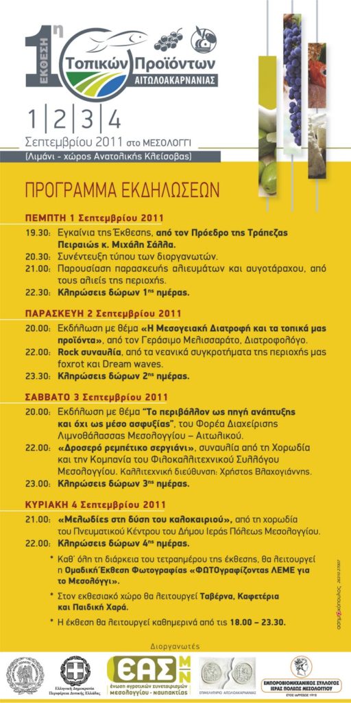 Η 1η «Έκθεση Τοπικών Προϊόντων Αιτωλοακαρνανίας» που διοργανώνεται στο Μεσολόγγι θα ανοίξει την Πέμπτη 1 Σεπτεμβρίου στις 7:30 το βράδυ, τις πύλες της για το κοινό και θα λειτουργήσει καθημερινά με ελεύθερη είσοδο έως και την Κυριακή 4 Σεπτεμβρίου.