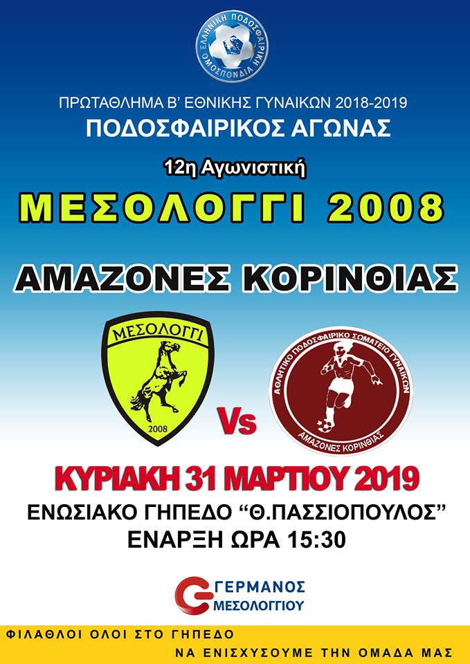 Τις “ΑΜΑΖΟΝΕΣ Κορινθίας” θα αντιμετωπίσει η γυναικεία ομάδα ποδοσφαίρου “ΜΕΣΟΛΟΓΓΙ 2008” την προσεχή Κυριακή 31/3 στις 3:30 μ.μ. στο ενωσιακό γήπεδο ποδοσφαίρου Θ. Πασσιόπουλος.