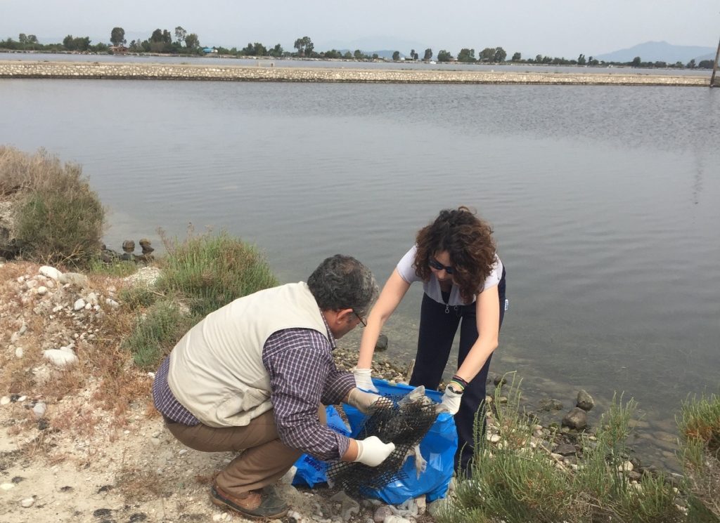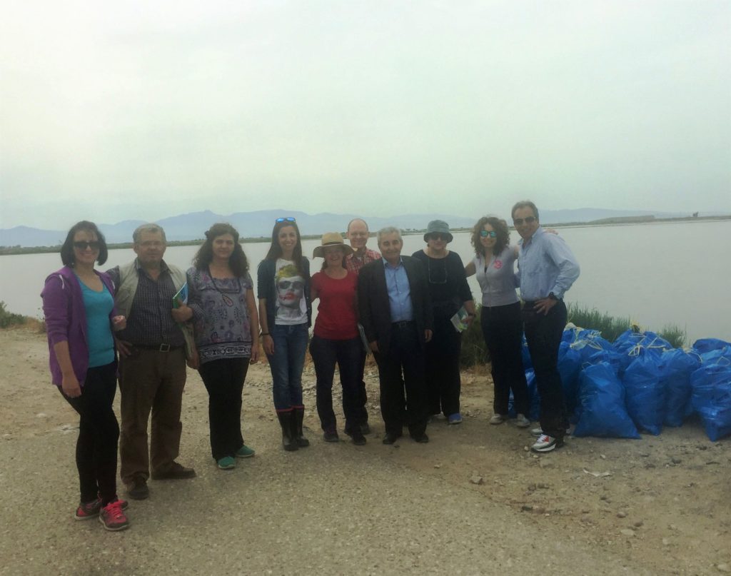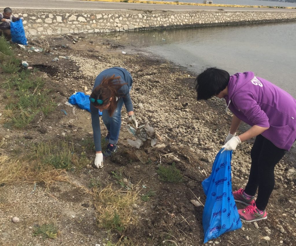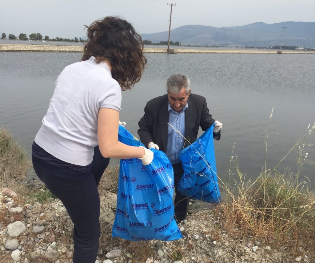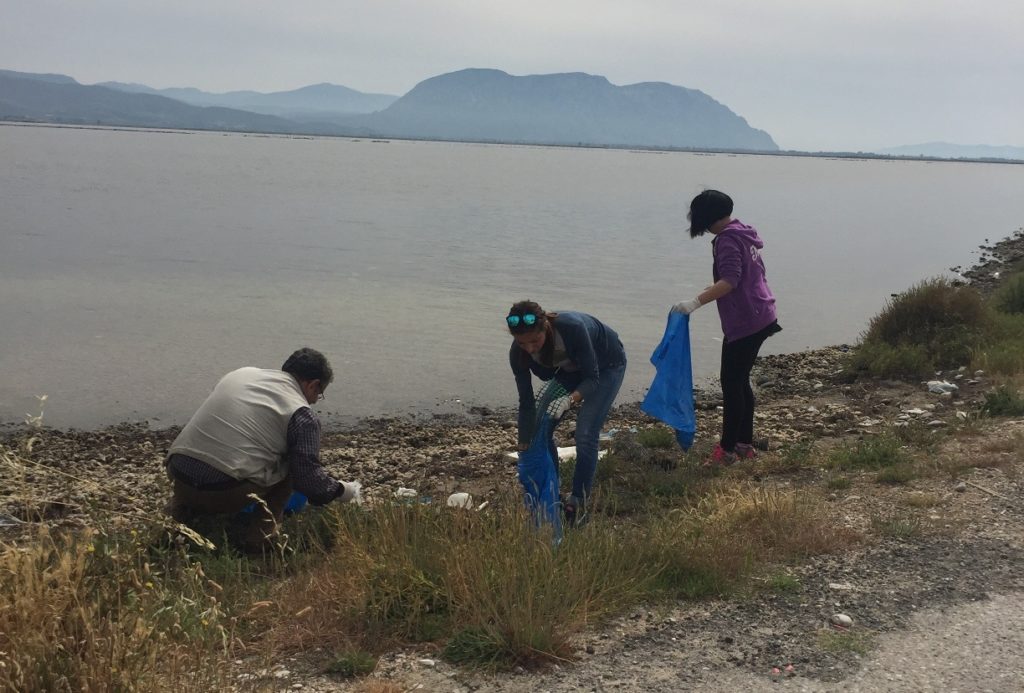 καθαρίζοντας την παραλία της Τουρλίδας στη λιμνοθάλασσα του Μεσολογγίου.