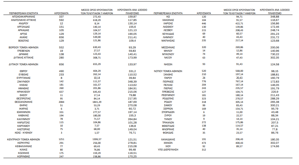Τα νέα εργαστηριακά επιβεβαιωμένα κρούσματα της νόσου που καταγράφηκαν τις τελευταίες 24 ώρες είναι 17.662, εκ των οποίων 53 εντοπίστηκαν κατόπιν ελέγχων στις πύλες εισόδου της χώρας. Ο συνολικός αριθμός των κρουσμάτων ανέρχεται σε 2.002.206 (ημερήσια μεταβολή +0.9%), εκ των οποίων 49.8% άνδρες. Με βάση τα επιβεβαιωμένα κρούσματα των τελευταίων 7 ημερών, 412 θεωρούνται σχετιζόμενα με ταξίδι από το εξωτερικό και 2.472 είναι σχετιζόμενα με ήδη γνωστό κρούσμα.