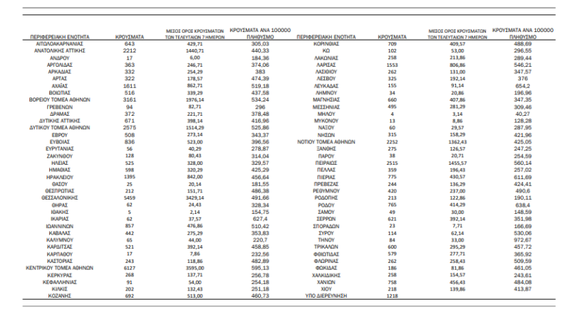 Τα νέα εργαστηριακά επιβεβαιωμένα κρούσματα κορονοϊός που καταγράφηκαν τις τελευταίες 24 ώρες είναι 50.126, εκ των οποίων 52 εντοπίστηκαν κατόπιν ελέγχων στις πύλες εισόδου της χώρας. Ο συνολικός αριθμός των κρουσμάτων ανέρχεται σε 1.344.923 (ημερήσια μεταβολή +3,9%), εκ των οποίων 50,2% άνδρες. Με βάση τα επιβεβαιωμένα κρούσματα των τελευταίων 7 ημερών, 264 θεωρούνται σχετιζόμενα με ταξίδι από το εξωτερικό και 1.203 είναι σχετιζόμενα με ήδη γνωστό κρούσμα.