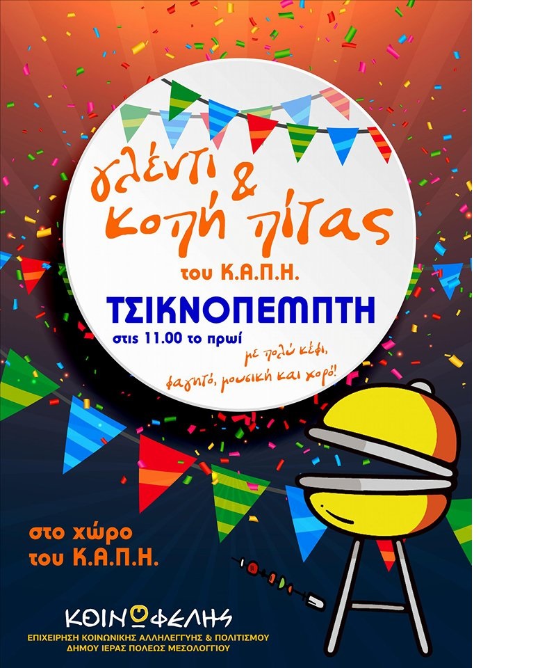 H Κοινωφελής Επιχείρηση Κοινωνικής Αλληλεγγύης και Πολιτισμού του Δήμου Ιερής Πόλης Μεσολογγίου, διοργανώνει εκδήλωση στο ΚΑΠΗ Μεσολογγίου για την κοπή της πρωτοχρονιάτικης πίτας των μελών του και παράλληλα τη γιορτή της Τσικνοπέμπτης την Πέμπτη 8 Φεβρουαρίου και ώρα 11.00 π.μ. στο χώρο του ΚΑΠΗ στο Μεσολόγγι.