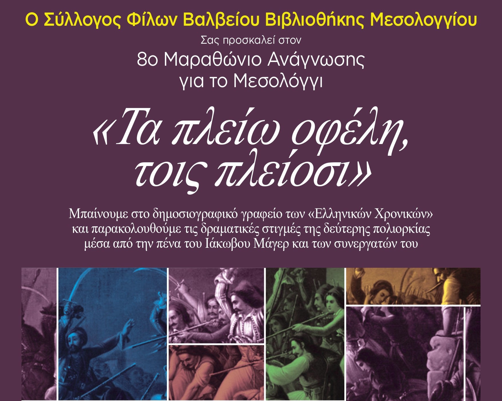 Στο πλαίσιο των επετειακών δράσεων για τα 200 χρόνια από την Έξοδο, ο Δήμος Ιεράς Πόλεως Μεσολογγίου και ο Σύλλογος Φίλων της Βαλβείου Βιβλιοθήκης διοργανώνουν την Παρασκευή 27 Μαρτίου 2026 τον 8ο Μαραθώνιο Ανάγνωσης για το Μεσολόγγι, με τίτλο «Τα πλείω οφέλη, τοις πλείοσι», στο Μουσείο Ιστορίας & Τέχνης – Πινακοθήκη, στην κεντρική πλατεία της πόλης.