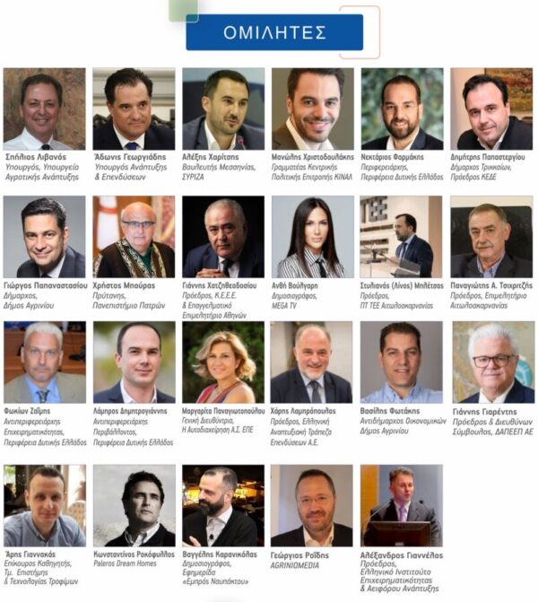 Ο περιφερειάρχης Δυτικής Ελλάδας Νεκτάριος Φαρμάκης, ο πρόεδρος της ΚΕΔΕ Δημήτρης Παπαστεργίου, ο δήμαρχος Αγρινίου Γιώργος Παπαναστασίου είναι μεταξύ των ομιλητών όπως εξάλλου και ο πρύτανης του Πανεπιστημίου Πατρών Χρήστος Μπούρας, ο πρόεδρος της Ελληνικής Αναπτυξιακής Τράπεζας Επενδύσεων Χάρης Λαμπρόπουλος και ο πρόεδρος της Κεντρικής Ένωσης Επιμελητηρίων Ιωάννης Χατζηθεοδοσίου.