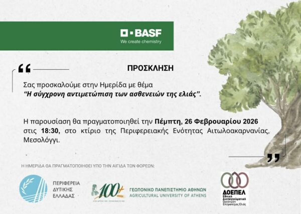 Ημερίδα με θέμα «Η σύγχρονη αντιμετώπιση των ασθενειών της ελιάς» θα πραγματοποιηθεί στο Μεσολόγγι την Πέμπτη 26 Φεβρουαρίου 2026, στις 18:30, στο κτίριο της Περιφερειακής Ενότητας Αιτωλοακαρνανίας, φέρνοντας στο επίκεντρο ένα ζήτημα ιδιαίτερα σημαντικό για τον αγροτικό κόσμο και την ελαιοπαραγωγή της περιοχής.