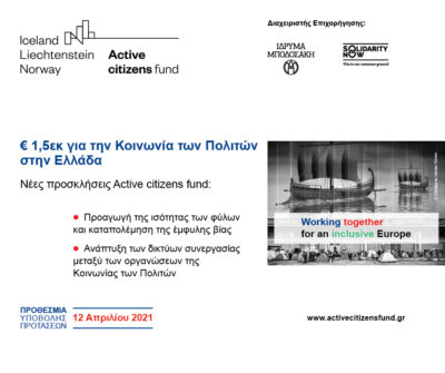 Το Ίδρυμα Μποδοσάκη και το SolidarityNow, με την ιδιότητα του Διαχειριστή Επιχορήγησης του προγράμματος Active citizens fund για την Ελλάδα, το οποίο έχει ήδη διαθέσει πάνω από € 7 εκ. για την ενίσχυση της Κοινωνίας των Πολιτών, ανακοινώνει 2 νέες προσκλήσεις εκδήλωσης ενδιαφέροντος. Οι νέες προσκλήσεις αφορούν στην προαγωγή της ισότητας των φύλων και στην ανάπτυξη των δικτύων μεταξύ των οργανώσεων της Κοινωνίας των Πολιτών.
