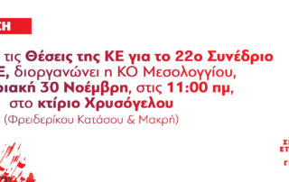 Την Κυριακή 30 Νοεμβρίου, στις 11:00 το πρωί, η Κομματική Οργάνωση Μεσολογγίου του ΚΚΕ διοργανώνει ανοιχτή συζήτηση με θέμα τις Θέσεις της Κεντρικής Επιτροπής για το 22ο Συνέδριο του Κομμουνιστικού Κόμματος Ελλάδας, το οποίο θα πραγματοποιηθεί από 29 έως 31 Ιανουαρίου 2026. Η εκδήλωση θα λάβει χώρα στο Κτίριο Χρυσόγελου [...]