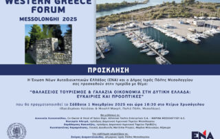 Στο πλαίσιο του WESTERN GREECE FORUM MESSOLONGHI 2025, η Ένωση Νέων Αυτοδιοικητικών Ελλάδος (ΕΝΑ) και ο Δήμος Ιερής Πόλης Μεσολογγίου διοργανώνουν ημερίδα με θέμα «Θαλάσσιος Τουρισμός & Γαλάζια Οικονομία στη Δυτική Ελλάδα: Ευκαιρίες και Προοπτικές». Η εκδήλωση θα πραγματοποιηθεί το Σάββατο 1 Νοεμβρίου 2025 και ώρα 18:30, στο Κτίριο [...]