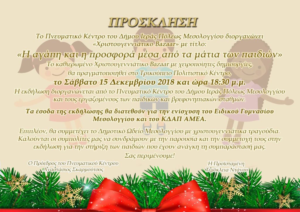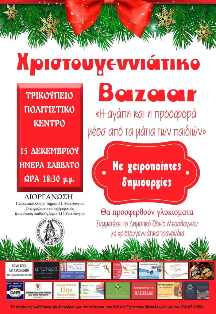 Αφιερωμένο στα παιδιά του Ειδικού Γυμνασίου Μεσολογγίου και του ΚΔΑΠ ΑΜΕΑ είναι το φετινό bazaar που διοργανώνουν το Πνευματικό Κέντρο και οι εργαζόμενοι στους