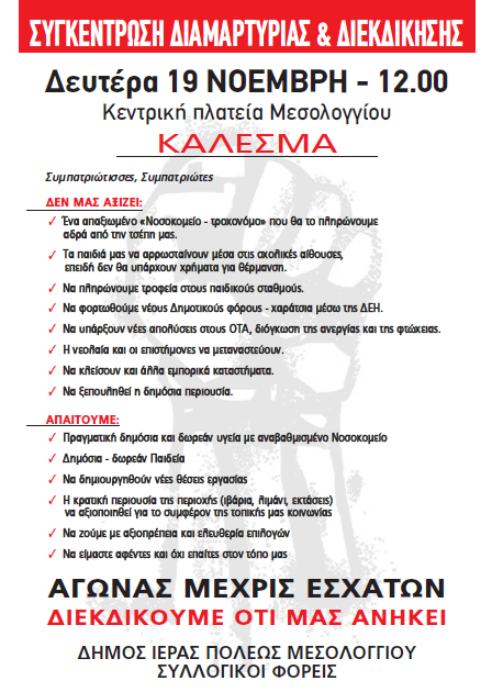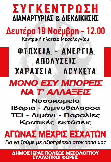 Ο Δήμος Ιεράς Πόλεως Μεσολογγίου και οι Συλλογικοί Φορείς της περιοχής στα πλαίσια των αγωνιστικών δράσεων και διεκδικήσεων, καλούν τη κοινωνία του Μεσολογγίου στη συγκέντρωση διαμαρτυρίας τη Δευτέρα 19 Νοεμβρίου και ώρα 12:00 το μεσημέρι στη Κεντρική Πλατεία Μεσολογγίου.