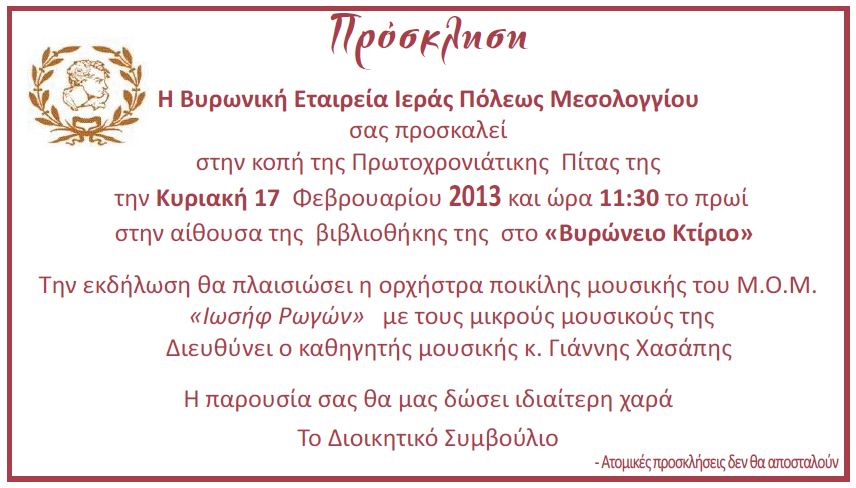 Κυριακή 17 Φεβρουαρίου, στις 11:30 το πρωί, εκδήλωση για την κοπή της πρωτοχρονιάτικης