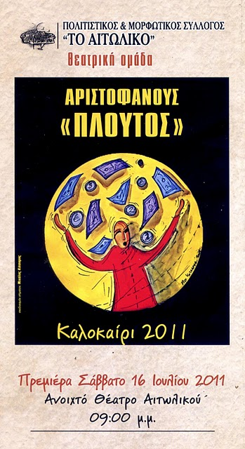 Την κωμωδία του Αριστοφάνη «Πλούτος» θα παρουσιάσει το Σάββατο 16 Ιουλίου, στις 9 το βράδυ, στο ανοιχτό θέατρο Αιτωλικού, η θεατρική ομάδα του Πολιτιστικού – Μορφωτικού συλλόγου «ΤΟ ΑΙΤΩΛΙΚΟ».