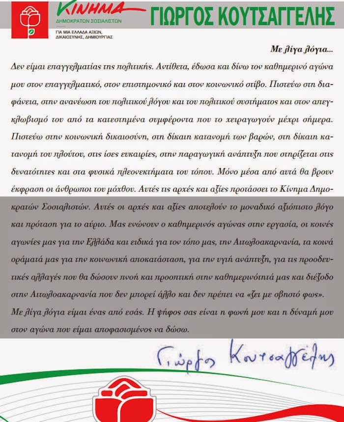 δρέου Κίνημα Δημοκρατών Σοσιαλιστών είναι στις εκλογές ο δικηγόρος Γιώργος Κουτσαγγέλης.