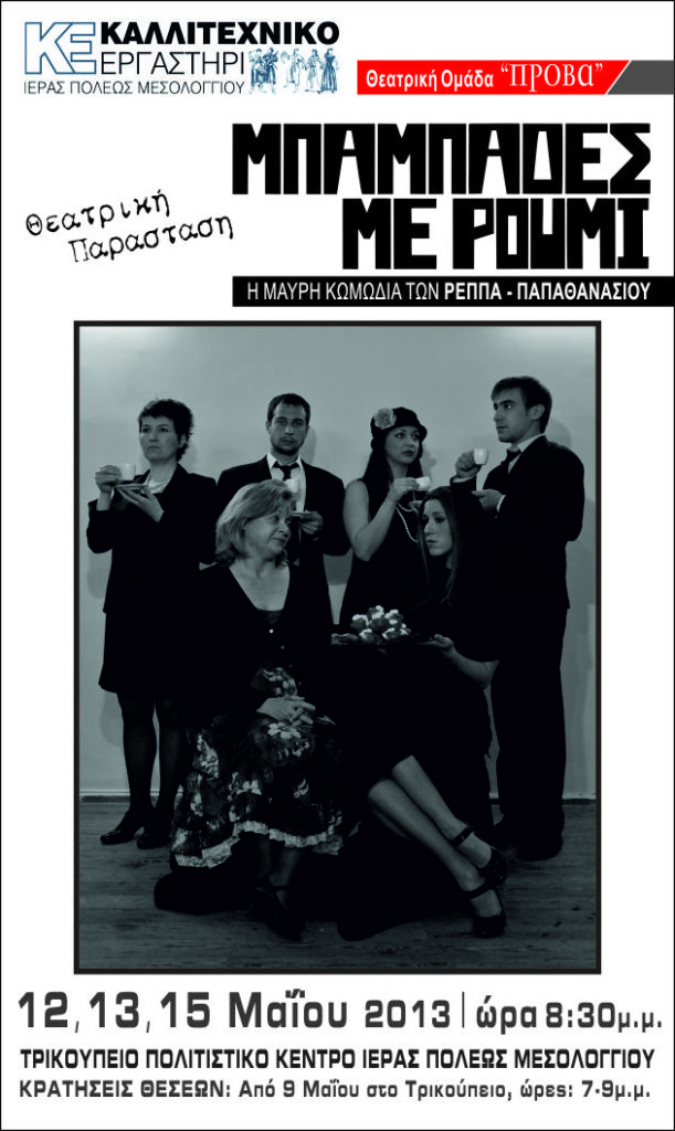 Η θεατρική ομάδα “Πρόβα” του Καλλιτεχνικού εργαστηρίου Ι.Π.Μεσολογγίου παρουσιάζει την μαύρη κωμωδία των Ρέππα-Παπαθανασίου “Μπαμπάδες με ρούμι“.