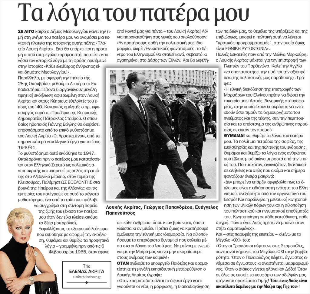 ι στη σύντομη πορεία της ζωής του (έχασα τον πατέρα μου όταν δεν είχα κλείσει ακόμα τα δέκα μου χρόνια).Ξεφυλλίζοντας το εξαιρετικό λεύκωμα που εκδόθηκε με αφορμή την εκδήλωση, θυμάμαι και θυμίζω τα προφητικά λόγια- γραμμένα πριν από τις 6 Φεβρουαρίου 1965, όταν έφυγε από κοντά μας για πάντα- του Λουκή Ακρίτα! Λόγια παρακαταθήκη στις γενιές που ακολούθησαν: «Αν κρατήσουμε ορθή την πολιτιστική μας ιδιομορφία, χωρίς εθνικιστικούς φανατισμούς, το δέντρο του Ελληνισμού θα σταθεί ξανά, σεβαστό κι αγαπημένο, στο Δάσος των Εθνών. Και θα ωφελήσει