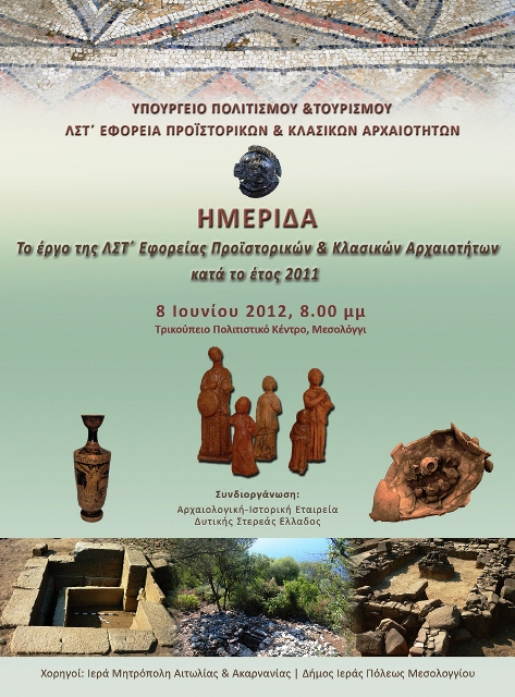Η Λ΄ΣΤ΄ Εφορεία Προϊστορικών & Κλασσικών Αρχαιοτήτων που εδρεύει στο Μεσολόγγι διοργανώνει απολογιστική ημερίδα για το έργο που έγινε κατά το έτος 2011, απόψε, στις 8 το βράδυ στο Τρικούπειο Πολιτιστικό Κέντρο Μεσολογγίου.