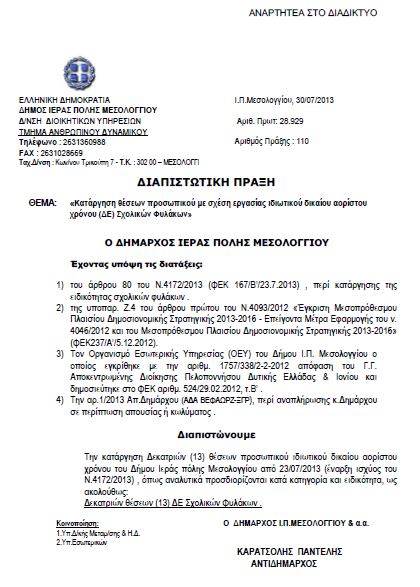 πράξη για την κατάργηση 13 θέσεων σχολικών φυλάκων από το δήμο Μεσολογγίου και