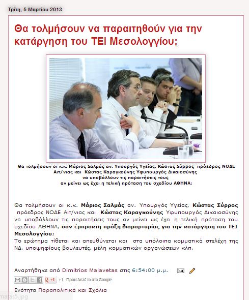 “Θα τολμήσουν οι κ.κ. Μάριος Σαλμάς αν. Υπουργός Υγείας, Κώστας Σύρρος πρόεδρος ΝΟΔΕ Αιτ/νιας και Κώστας Καραγκούνης Υφυπουργός Δικαιοσύνης να υποβάλλουν τις παραιτήσεις τους αν μείνει ως έχει η τελική πρόταση του σχεδίου ΑΘΗΝΑ, σαν έμπρακτη πράξη διαμαρτυρίας για την κατάργηση του ΤΕΙ Μεσολογγίου;