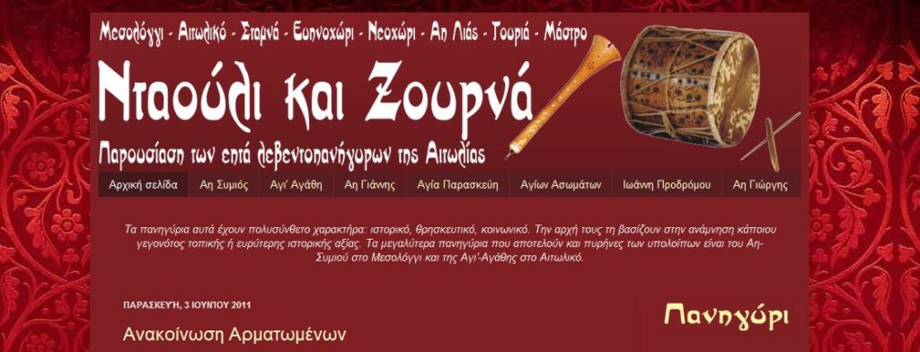 Μια ομάδα νέων από το Μεσολόγγι και συγκεκριμένα οι Π.Μπαταργιάς , Σ.Ζαβιτσάνος και Γ.Αλεξανδράτος δημιούργησαν την ιστοσελίδα με τίτλο «Νταούλι και Ζουρνά» στην οποία παρουσιάζουν τα παραδοσιακά πανηγύρια του δήμου Μεσολογγίου.