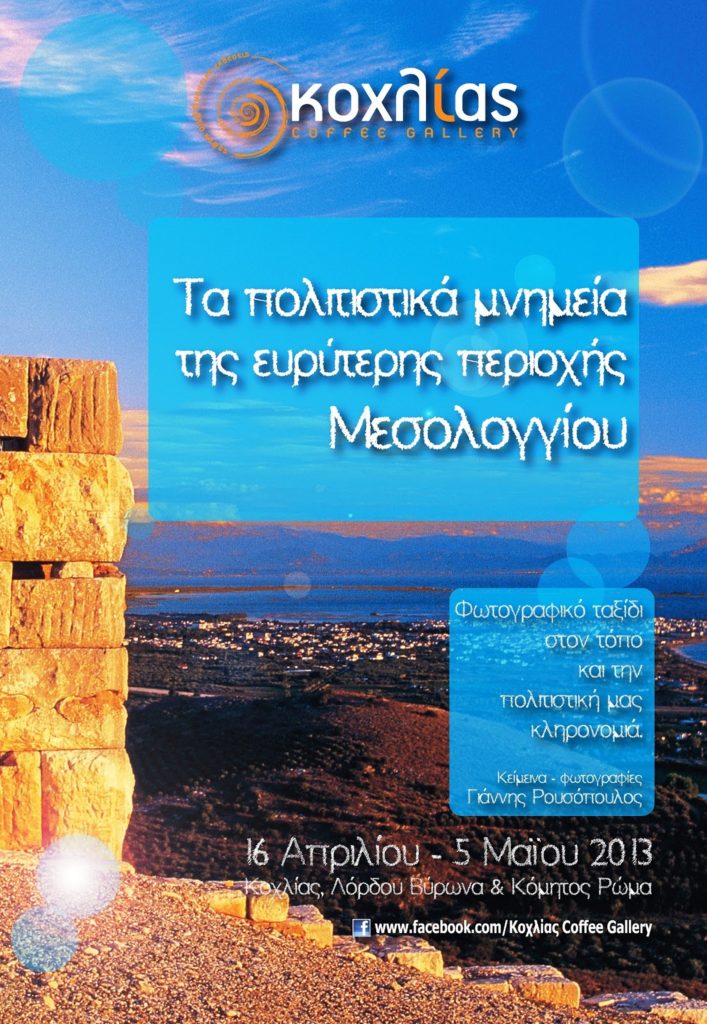 O “Κοχλίας” (Λ. Βύρωνος 27 και Κ. Ρόμα, Μεσολόγγι) παρουσιάζει στην gallery του ημιωρόφου, έκθεση με θέμα: ” Τα Πολιτιστικά μνημεία της ευρύτερης περιοχής Μεσολογγίου” με φωτογραφίες και κείμενα του κ. Γιάννη Ρουσόπουλου.
