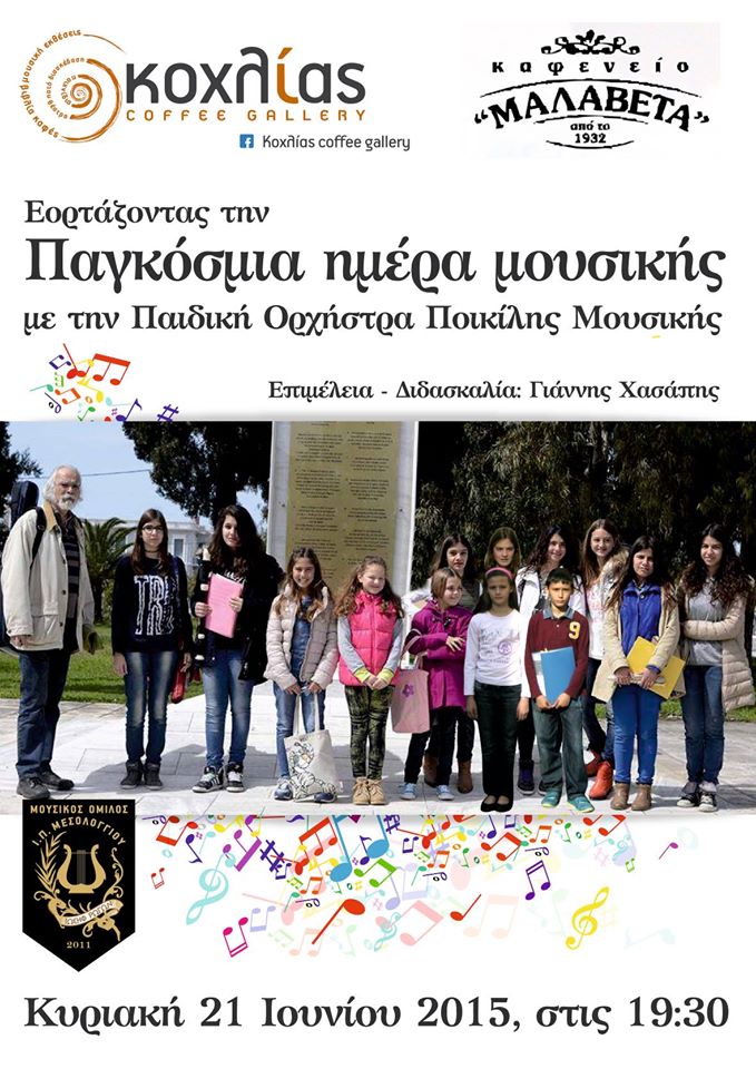 Την Κυριακή 21 Ιουνίου, στις 19,30 στον πεζόδρομο της Λ. Βύρωνος στο Μεσολόγγι μαζί με την Παιδική Ορχήστρα Ποικίλης Μουσικής του Μουσικού Ομίλου Ιεράς Πόλεως Μεσολογγίου “Ιωσήφ Ρωγών”, επιμέλειας και διδασκαλίας του κ. Γιάννη Χασάπη, θα γίνει εορταστική εκδήλωση την παγκόσμια ημέρα μουσικής, καθώς και τη μεγαλύτερη μέρα του έτους!
