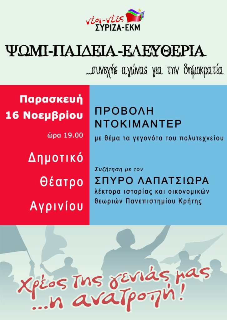 και νέοι του ΣΥΡΙΖΑ –ΕΚΜ διοργανώνουν την Παρασκευή 16 Νοεμβρίου 2012 και ώρα
