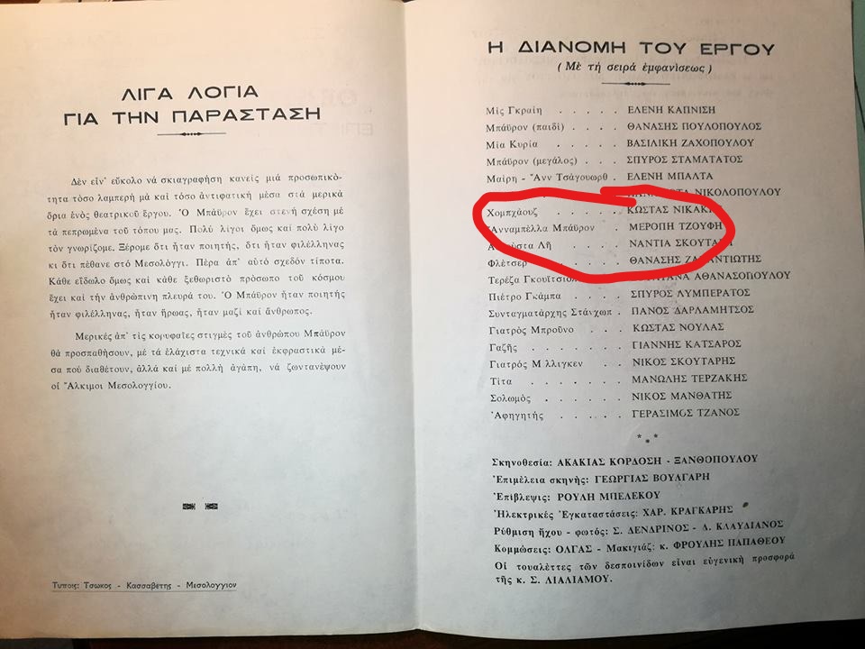 Στην παράσταση τον Λ. Βύρωνα «ενσάρκωσε» ο σημερινός γενικός διευθυντής της ΔΕΥΑΜ. Σπύρος Σταματάτος. Δεξιά του η κυρία Μερόπη Τζούφη και αριστερά του, η αείμνηστη Νάντια Σκούταρη που «ενσάρκωνε» την Αυγούστα Λη