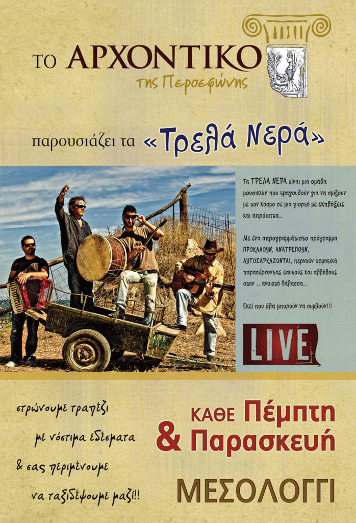 Κάθε Πέμπτη και Παρασκευή βράδυ, στο «Αρχοντικό της Περσεφόνης» στο Ιστορικό Κέντρο του Μεσολογγίου.